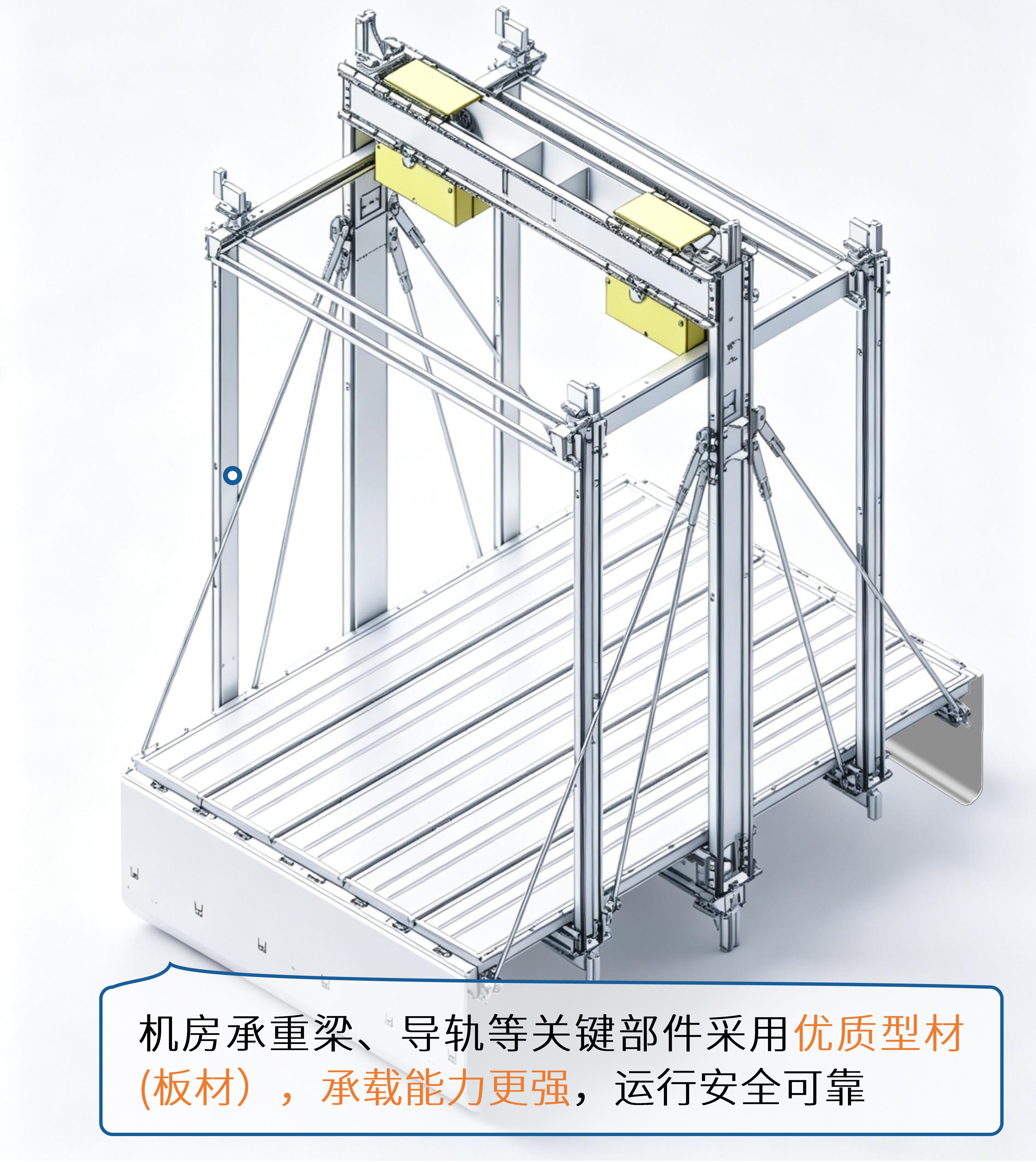 機(jī)房承重梁、導(dǎo)軌等關(guān)鍵部件采用優(yōu)質(zhì)型材(板材),承載能力更強(qiáng),運(yùn)行安全可靠